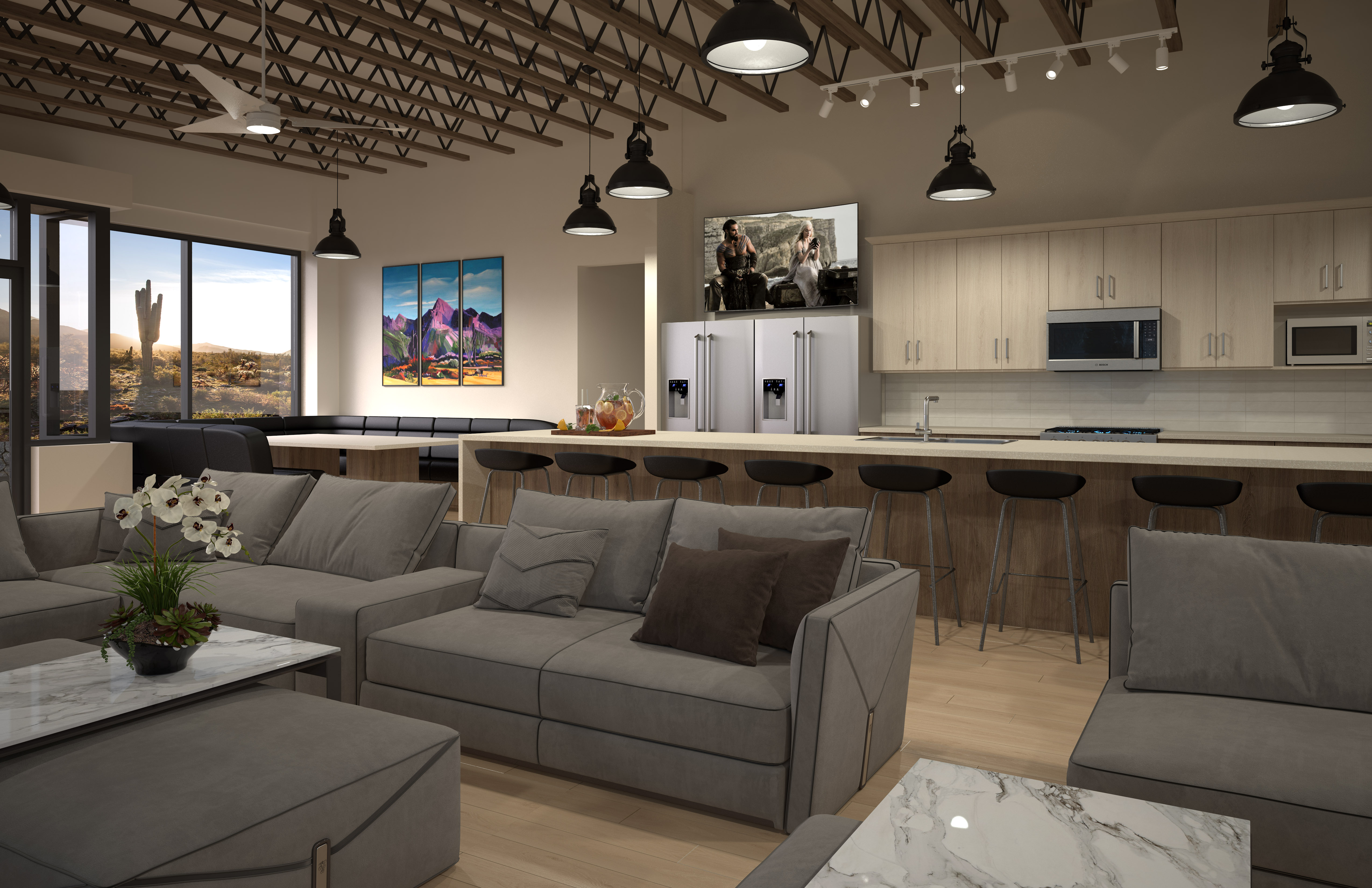 This newly renovated 17-bedrooms, 9-bathrooms boutique house offers open, airy common space with a top of the line luxury kitchen that presents stainless steel KitchenAid appliances, new cabinets, subway tile backsplash, quartz countertops, and a large island – the best weekend brunch spot to recharge.